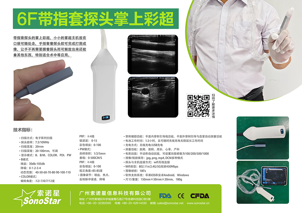 带指套探头的掌上彩超,小小的掌超主机放在口袋可随处走,手指套着探头即可完成打图成像,让手不再需要握着探头而可解放出来还能拿其他东西,特别适合术中等应用