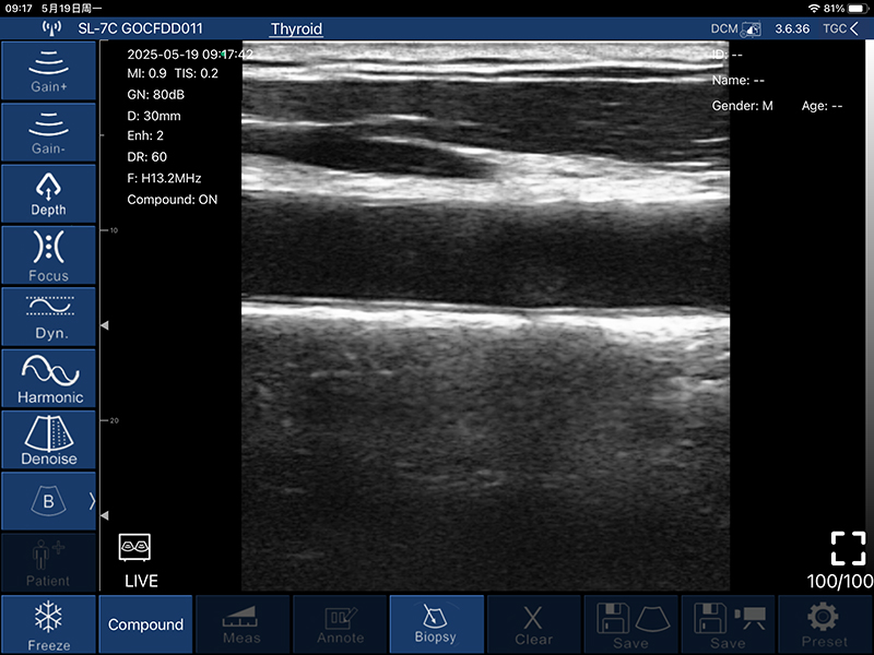 • 穿刺辅助功能:平面内穿刺引导线功能,平面外穿刺引导与血管自动测量功能