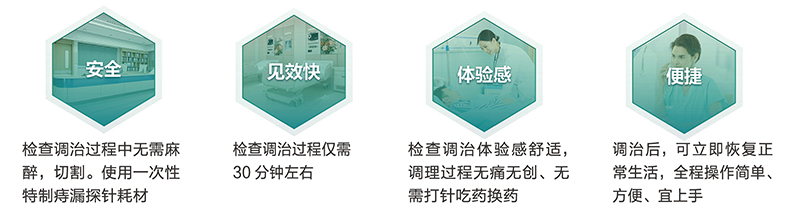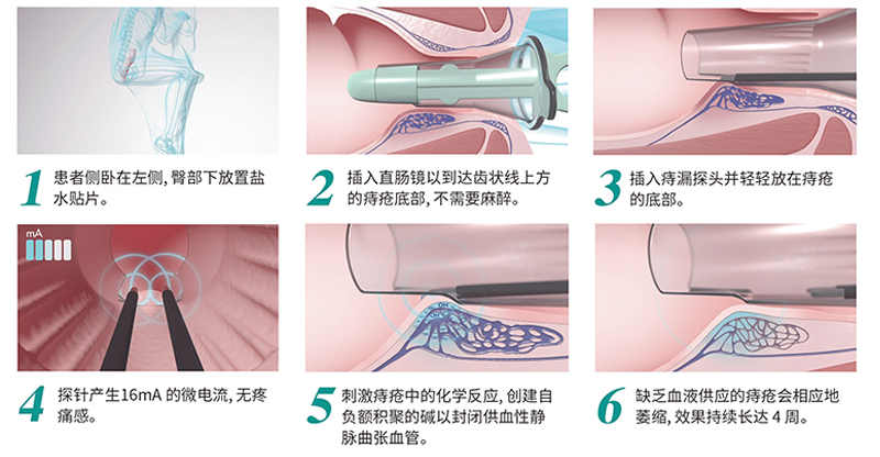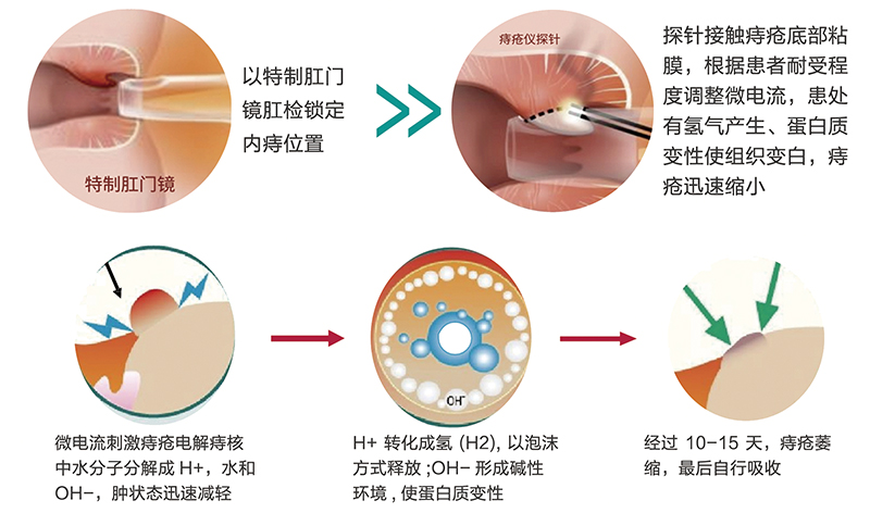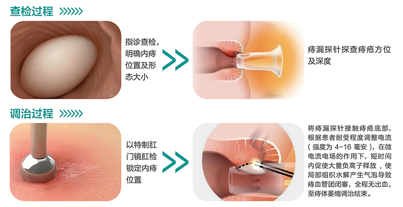 痔疮电解治疗法是在祖国医学枯痔钉疗法的理论体系和微电流电化学法理论的基础上加以改进、研发的一项无需麻醉无痛无创调治内痔及混合痔的一种特色理疗方法。适用于湿热下注、气滞血淤、脾虚气陷、阴虚肠燥型等人群,通过智能微电流理疗设备,连接配套特制痔漏探针在微电流电场的作用下,快速导致痔血管团闭塞,至到痔体萎缩、制止出血的效果,这种无痛无创无需麻醉的特色理疗法,真正实现了“无创断痔”的无痛新理念